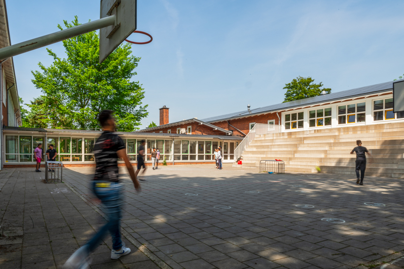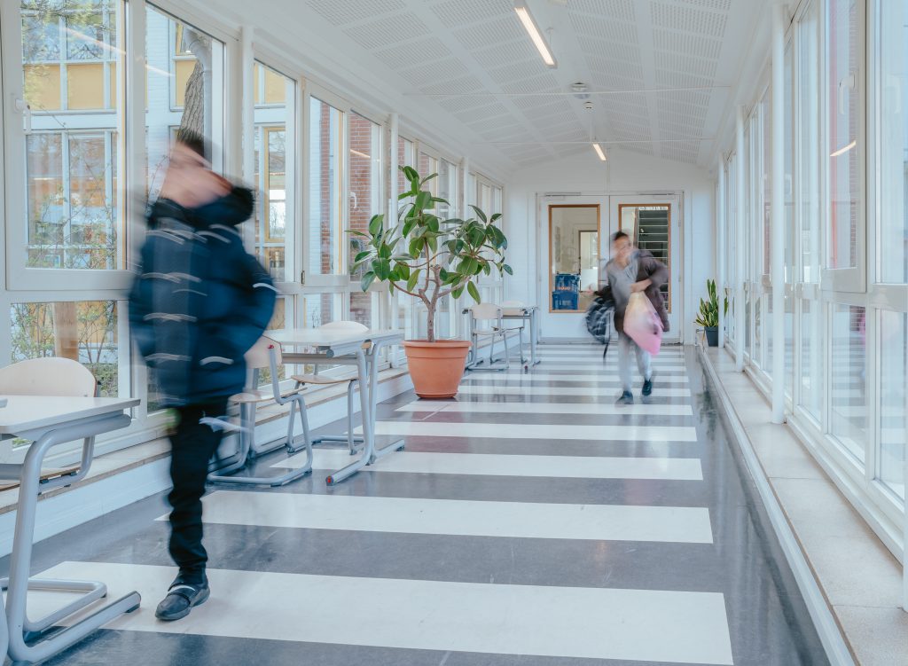 Bij het betreden van het gebouw komt u in de ontvangstruimte, waar de conciërge u welkom heet. Van daaruit komt u in de centrale hal. Daar ziet u ons podium, dat tevens dienst doet als bieb, bergruimte en werkruimte. In de hal gymmen onze kleuters. Met vouwwanden kunnen we een deel van de ruimte afschermen.